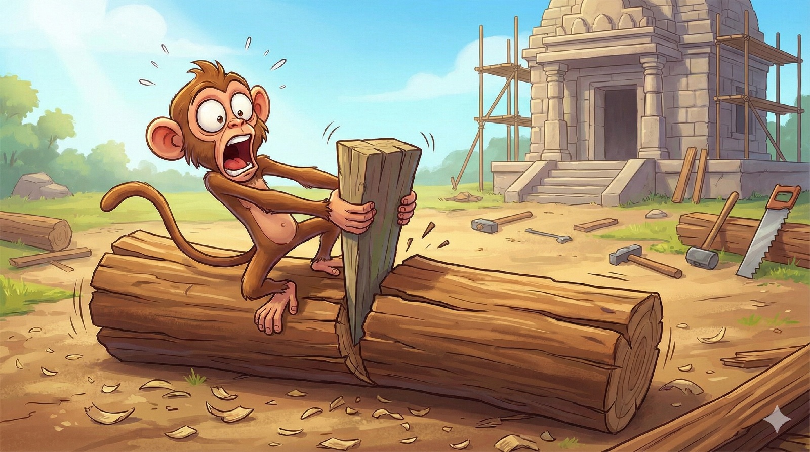 A curious monkey finds a split log at a construction site and…